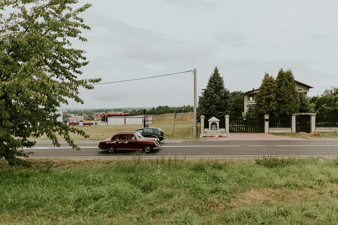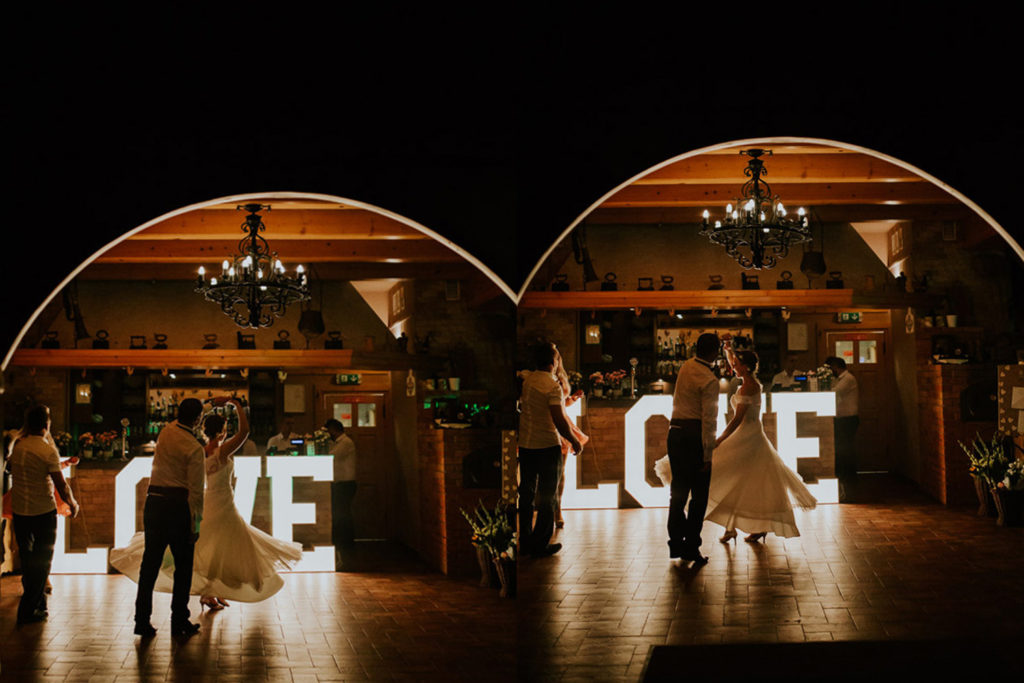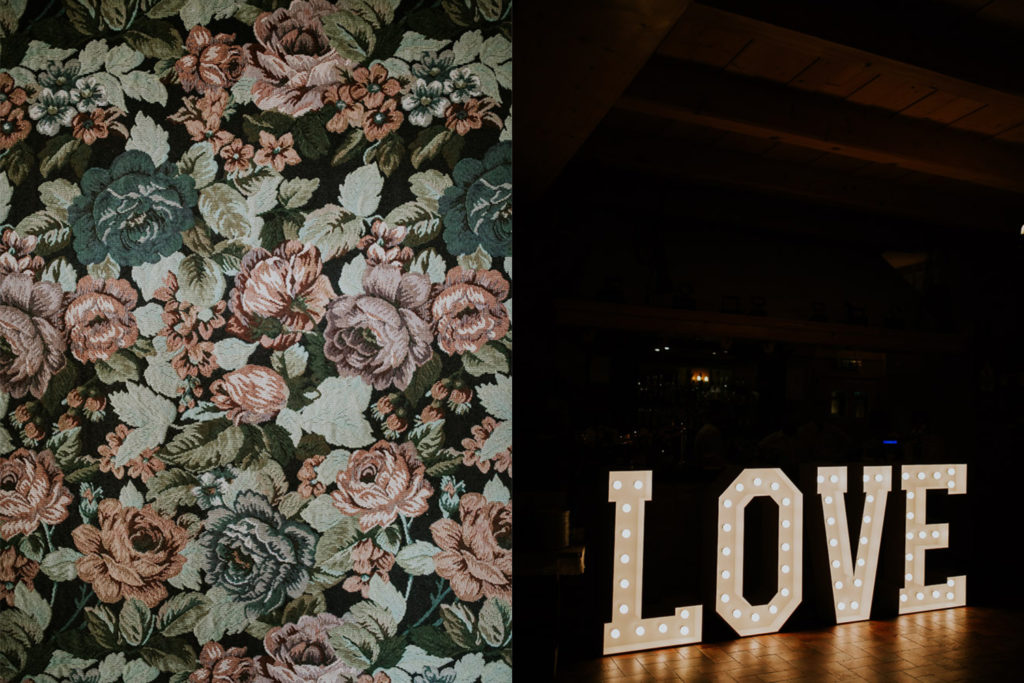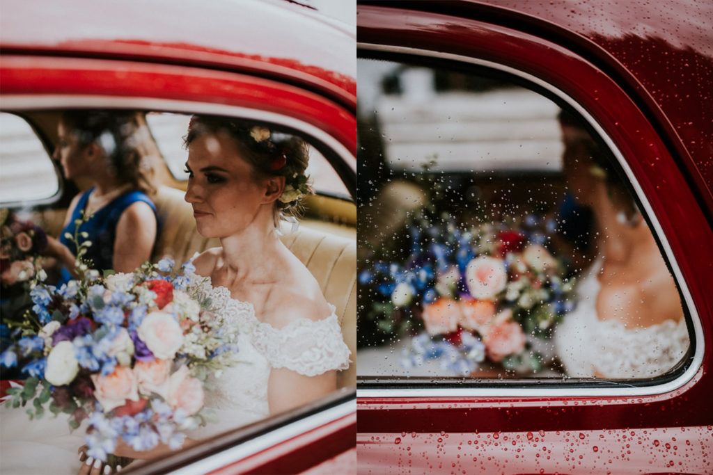 Piękna kolorystyka całej stylizacji; cudowny, pełny żywych kolorów bukiet ślubny; dający dużo, ładnego światła napis LOVE i uroczy, czerwony mercedes – re we la cja!